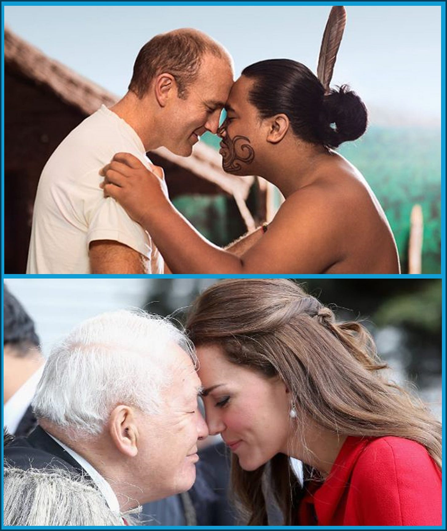 A ‘hongi’ is a Māori greeting. When you’re meeting someone, instead of just shaking their hand, you touch foreheads and you touch noses. You shake their hand with your right hand, and you put your left hand up on their shoulder. And all that has meaning. When you touch foreheads, you’re feeling the spirit of the other person. When you touch noses, you’re breathing in their essence. And when you shake their hand and put your other hand on their shoulder it means that you come empty handed, you come in peace, you don’t come to do battle.