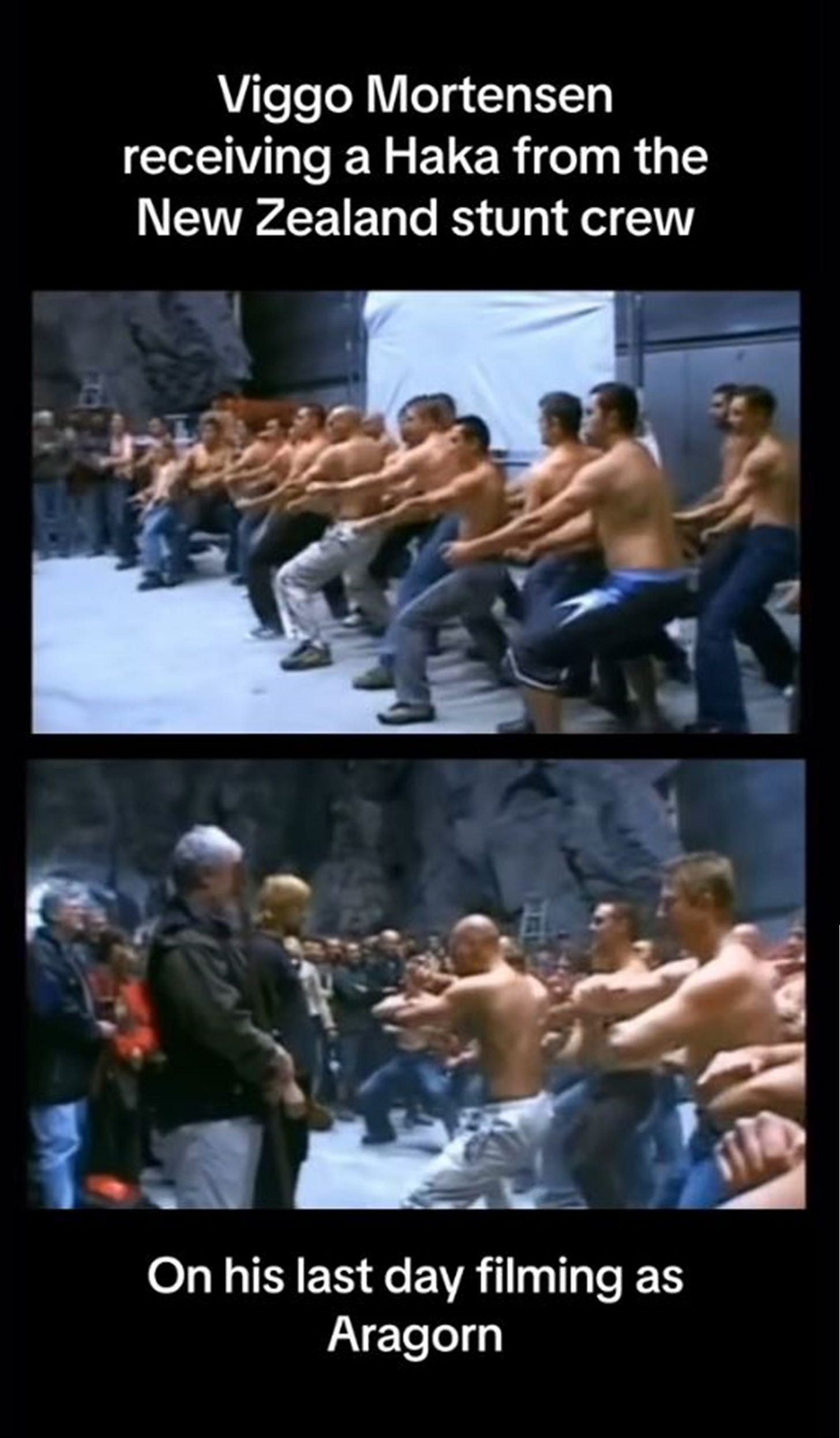 Viggo was left dumbstruck, he didn’t know how to react to that electrifying haka display at all. He managed to say just a few words of thanks then the 30 stunt guys all lined up to each in turn ‘hongi’ Viggo.