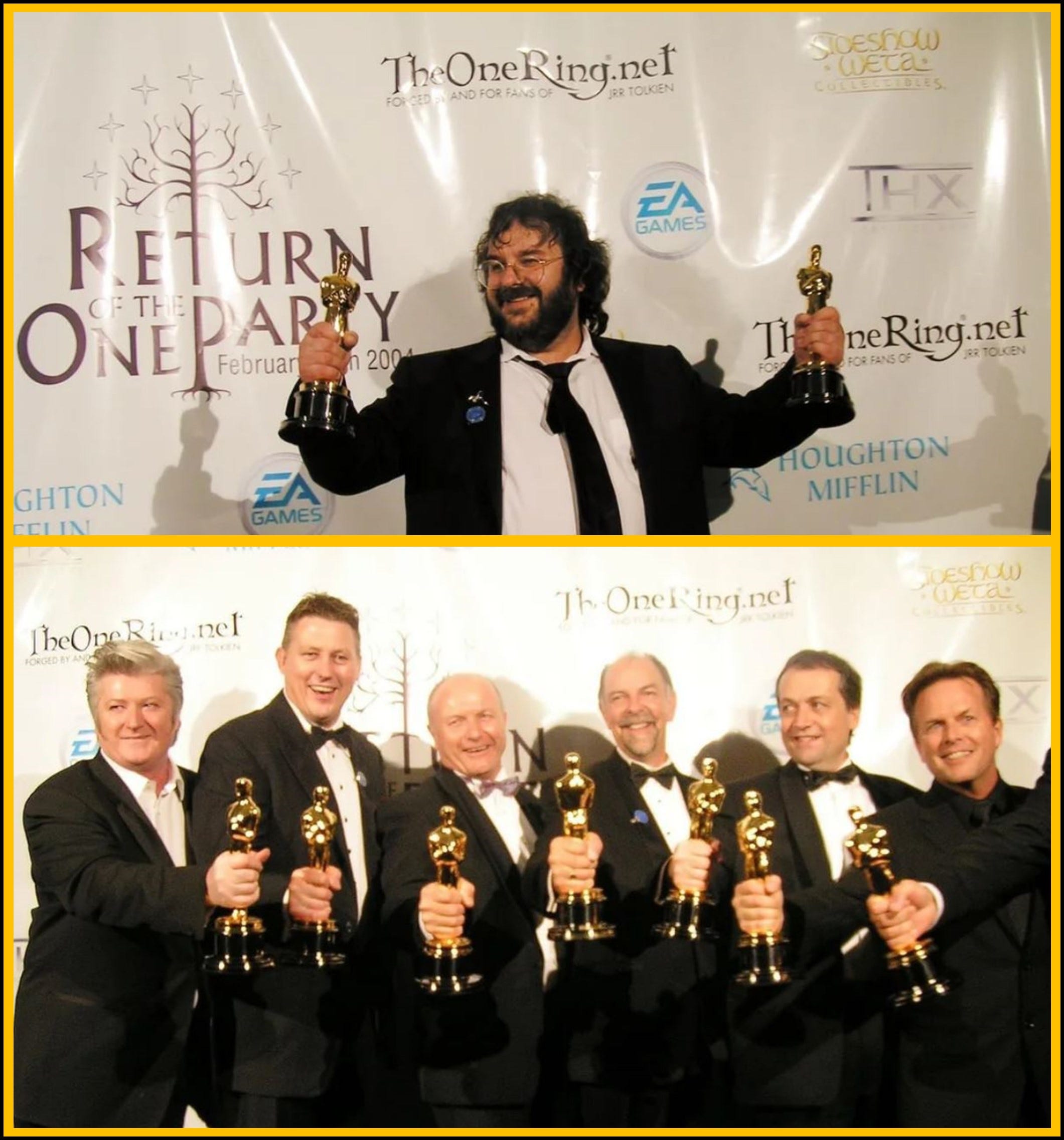 Richard Taylor (Weta Physical) had won two Oscars that night (Costume Design and Makeup). When you get those Oscars on the night, they don’t yet have name plaques on them, but they are individually numbered. So, there is a tiny difference between each golden Oscar. Well Richard didn’t want to forget which two were his. So, he had taken the little wire cap off a couple of bottles of champagne and stuck them on the heads of his two Oscars.