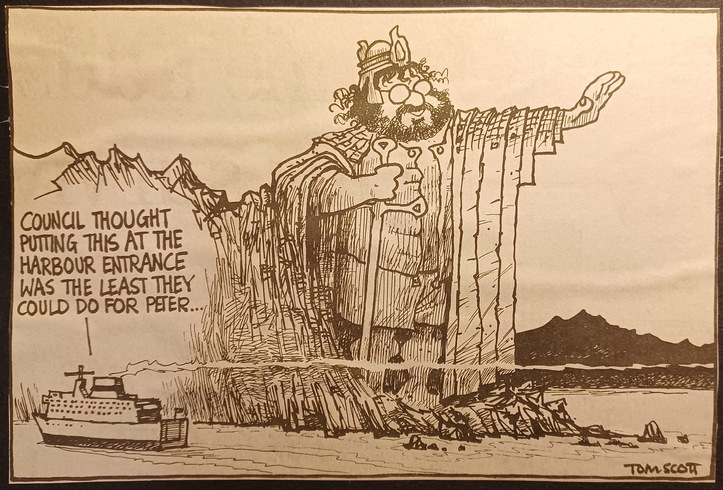 Newspaper cartoon showing the interisland ferry entering Wellington harbour, in the NZ city where Peter lives